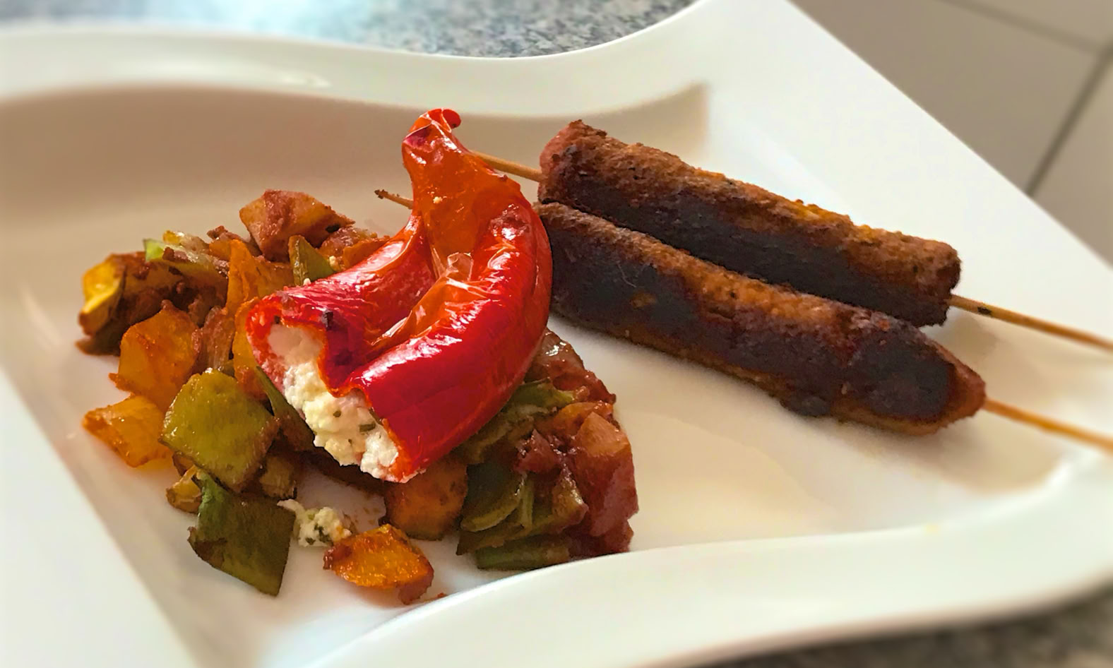 Also: Gut würzen! Dazu Paprika, gefüllt mit Feta, und eine deftige Gemüsepfanne.