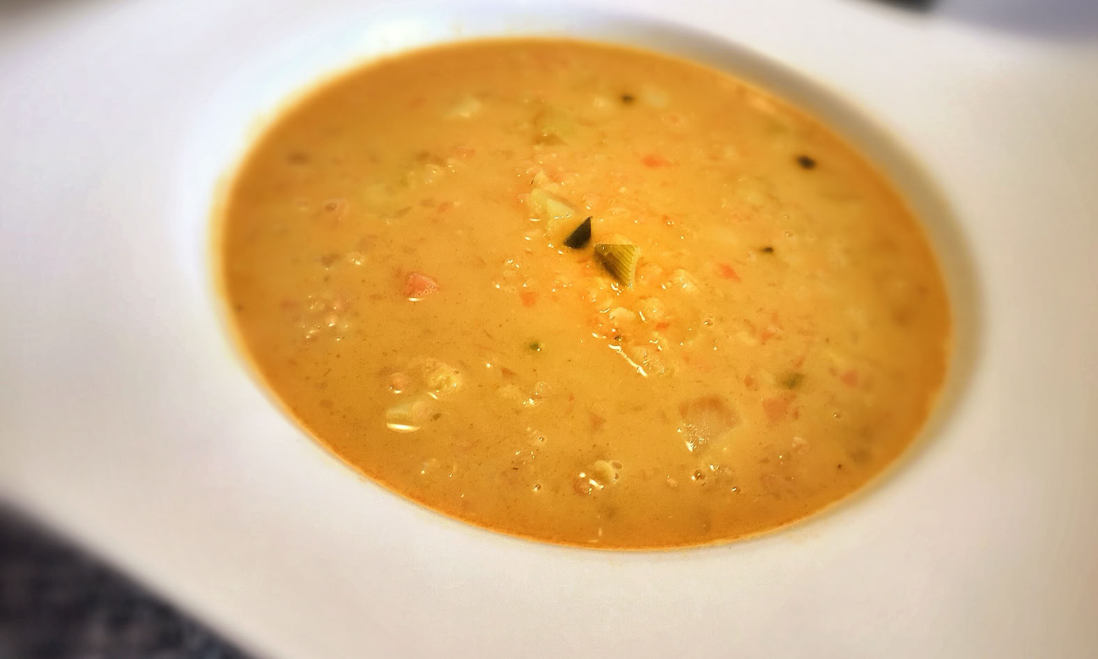 Ich gehe hier in eine ganz andere Richtung: Cocos, Curry und Linsen bilden zusammen eine schöne, geschmackliche Harmonie. Kartoffeln, Blumenkohl und Suppengrün bilden das klassische Element. Das Ergebnis: Exotisch, cremig mit leichter Schärfe.