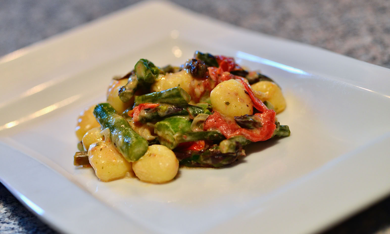 Die Gnocchis in die Pfanne zum Spargel und zu den Kirschtomaten geben. Die Frischkäsesoße darüber.