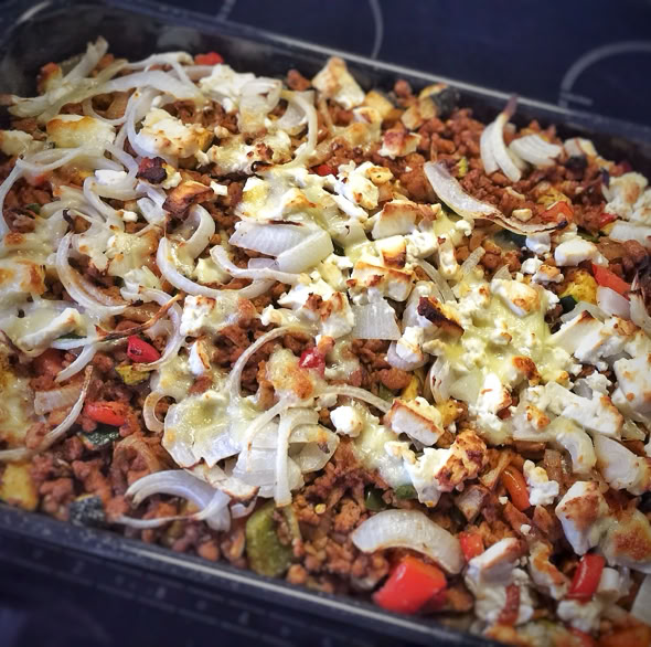 Ein Soja-Hack-Gemüse-Auflauf mit etwas Reis. Durch Gyros-Gewürz, rohe Zwiebeln und Feta 'griechisch' angehaucht. Wer Oliven mag (ich mag sie leider nicht), kann die noch gerne zum Auflauf dazugeben.