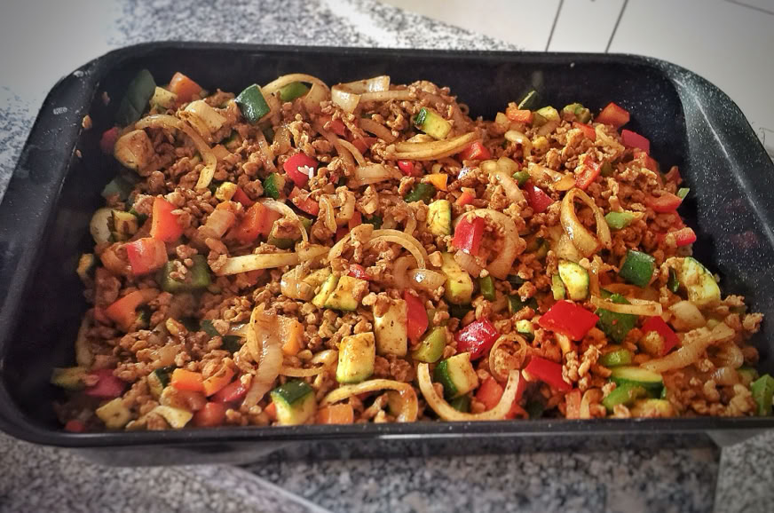 Jetzt die Zucchini und die Paprika dazugeben. Circa 10 Minuten anbraten lassen. Dabei alles gut umrühren. Wer es gerne etwas schärfer mag, kann gerne gehackte Peperoni dazugeben.