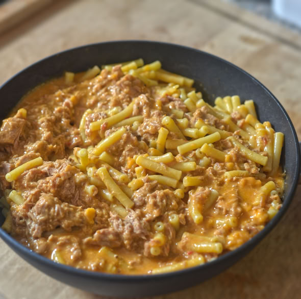 Natürlich kann man die Makkaroni in Thunfischsosse auch in eine ofenfeste Pfanne oder eine feuerfeste Form geben und mit Mozzarella gratinieren. Hierbei jedoch die Makkaroni eine Minute vor 'al dente' garen, damit sie in der Sosse fertig garen können.