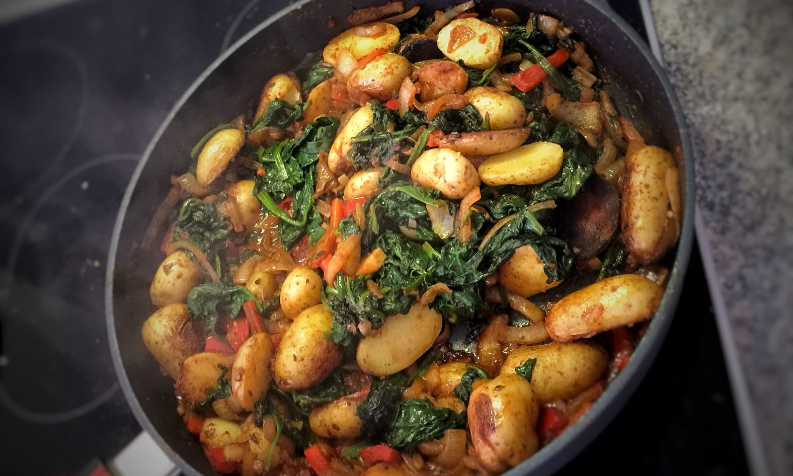 Die Drillinge braten wir in kleinen Portionen an, bis sie schön goldgelb und kross sind. Sie sollten sich nicht in der Pfanne stapeln. Ist der Pfannenboden bedeckt, reicht das für eine 'Ladung'. Ein paar Krümel Meersalz drüber und dann in die zweite, beschichtete Pfanne zu Zwiebel, Spinat und Paprika geben. Dann die nächste Ladung Drillinge in Angriff nehmen.