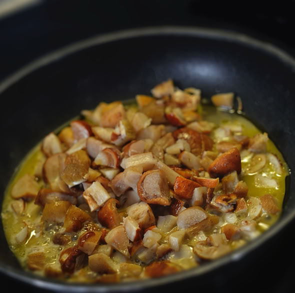 Die Steinpilze lassen wir in einer zweiten Pfanne nur in etwas Butter schmoren. Etwas Pfeffer und Salz dazu.