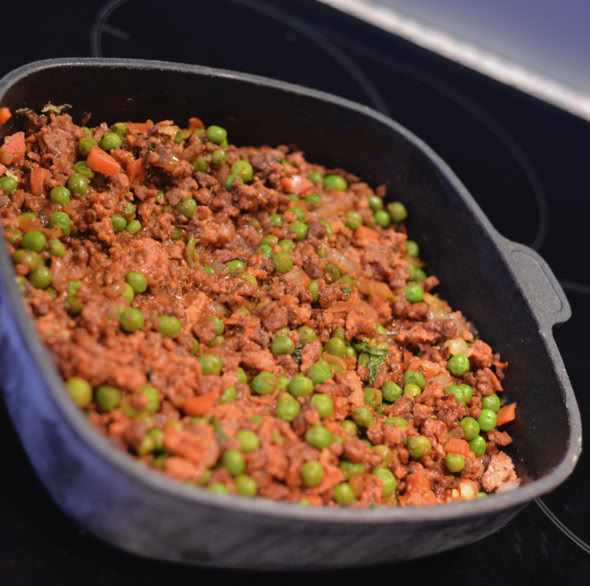 Dann wird gewürzt. Ihr könnt die Hack-Masse ruhig großzügig würzen, da der Kartoffelstampf viel von den Gewürzen absorbieren wird. Also mit Pfeffer, Salz, edelsüßem Paprika, Thymian und Worchester Sauce nicht geizen. Anschließend bildet ihr eine Mulde in der Pfanne und gebt das Tomatenmark hinzu. Das Mark muss etwas anrösten, um die Bitterstoffe zu verlieren. Anschließend mit Rotwein und Brühe ablöschen und einkochen lassen. Dann geben wir die Erbsen dazu. Fragt mich nicht warum... Erbsen scheinen in der britische Küche einfach unverzichtbar zu sein. Warum auch immer. Wenn die Hack-Masse etwas eingekocht ist, könnt ihr gerne noch etwas Reismehl zur Bindung hinzugeben.