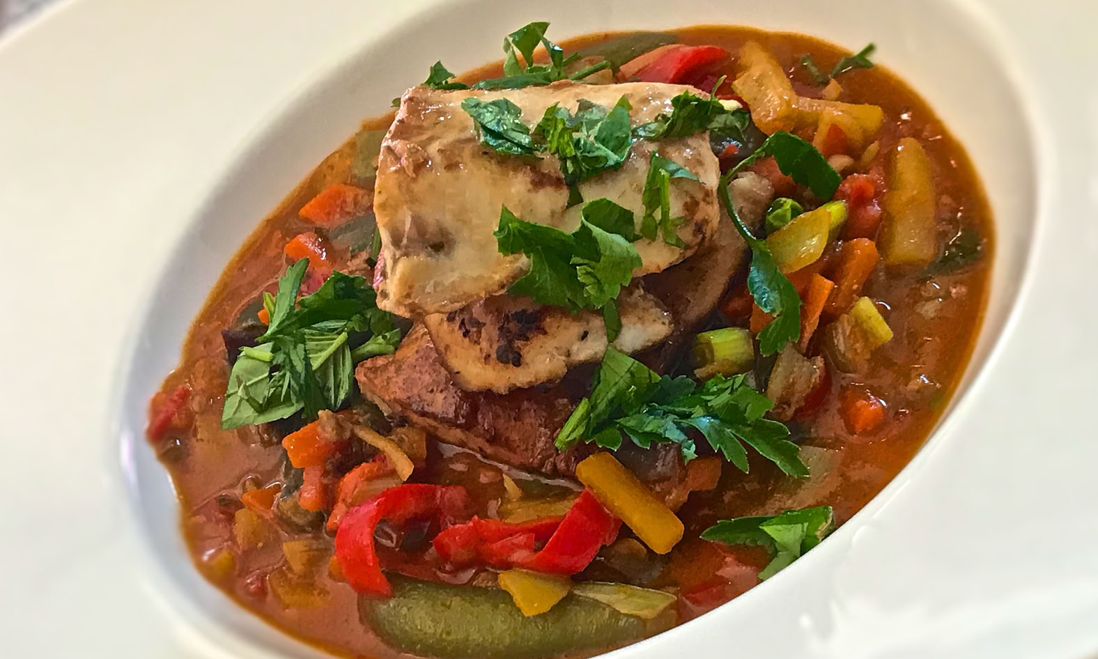 Dann kann serviert werden. Das Fischcurry mit Petersilie oder Koriander und geschnittenen Frühlingszwiebeln garnieren.
