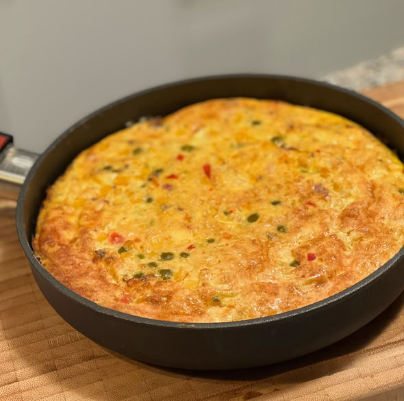 In den Eierteig der Frittata kann alles rein, was man so im Kühlschrank findet: Jede Art von Gemüse bis hin zu 'Gutes vom Vortag’. Es gibt kaum etwas, was nicht in eine Frittata passt. Die Frittata wird traditionell gebraten und im Gegensatz zu einem Omelette gewendet. Wir backen sie jedoch im Ofen.