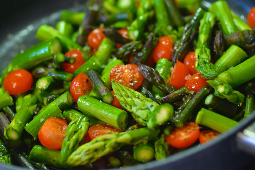 Olivenöl in eine Pfanne geben und den Spargel bei mittlerer Hitze langsam anbraten. Würze geben Meersalz und frischer Pfeffer. Die Kirschtomaten halbieren und ebenfalls in die Pfanne zum anbraten geben.