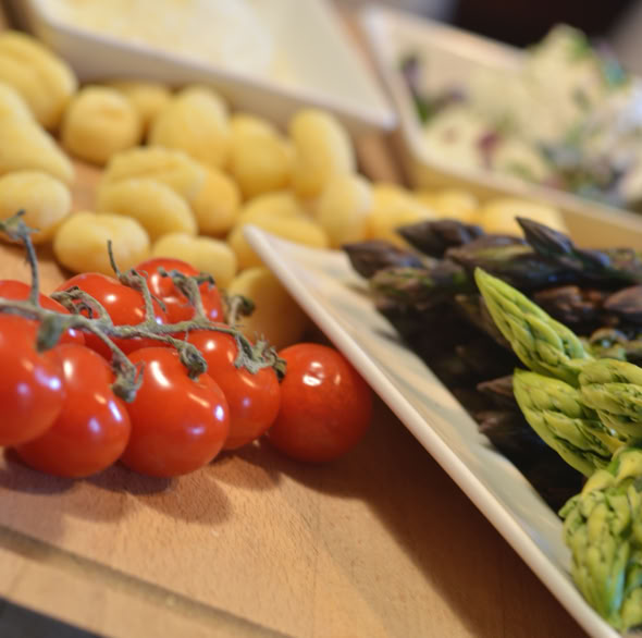 Die Gnocchis in die Pfanne zum Spargel und zu den Kirschtomaten geben. Die Frischkäsesoße darüber.