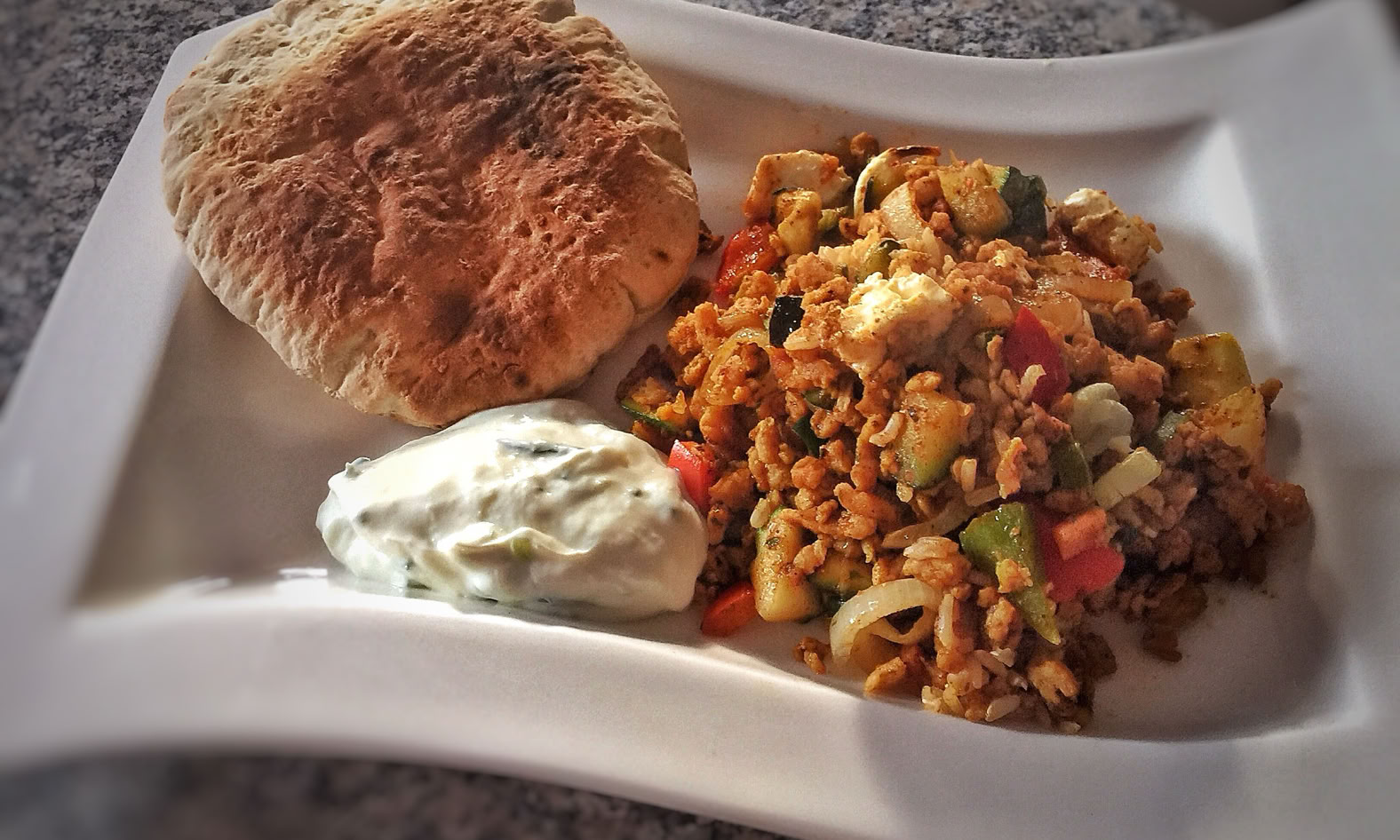 Dazu ein Stück Pita-Brot und etwas Tzaziki. Fertig.