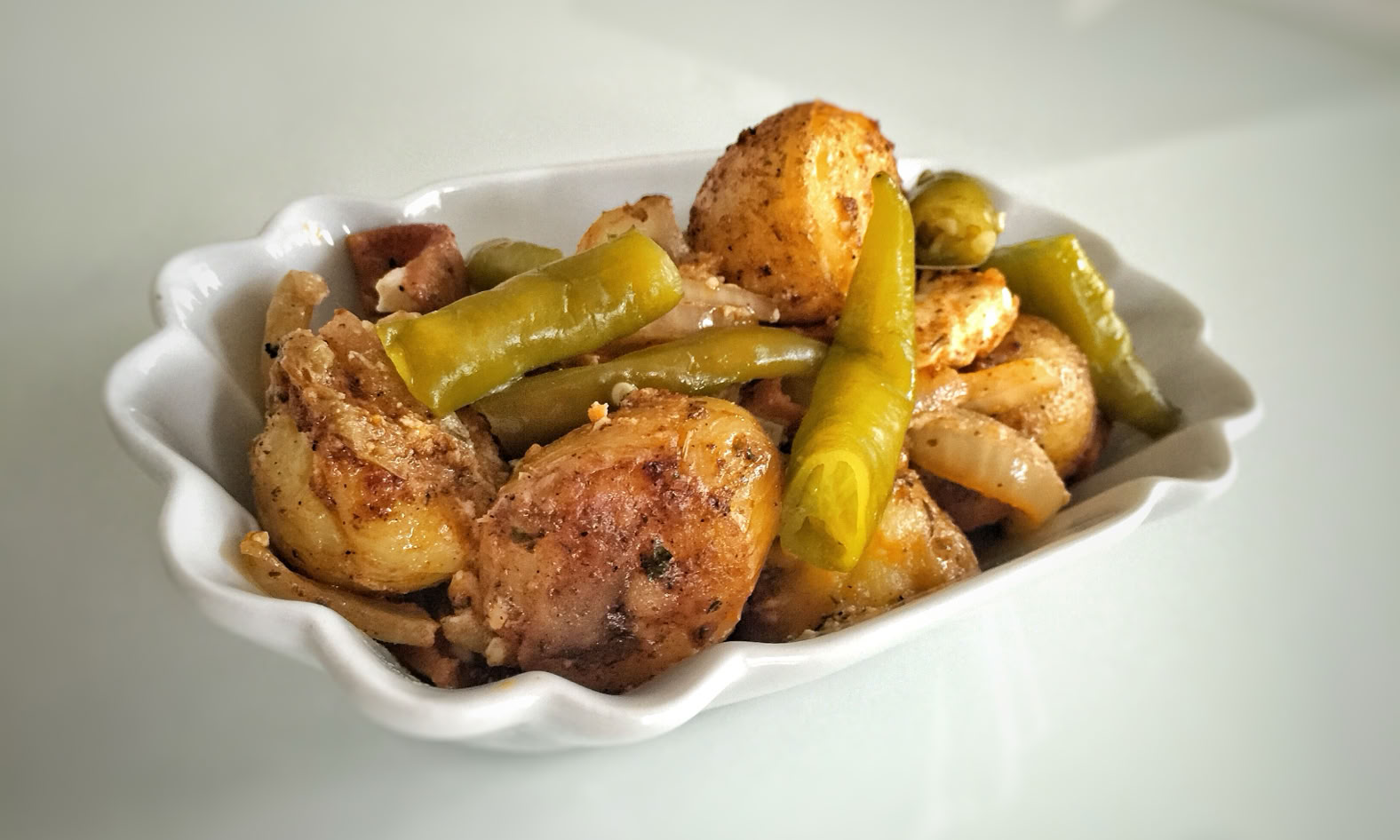 Es wurde eine Kartoffelpfanne 'Gyros-Art' mit Feta und Peperoni.