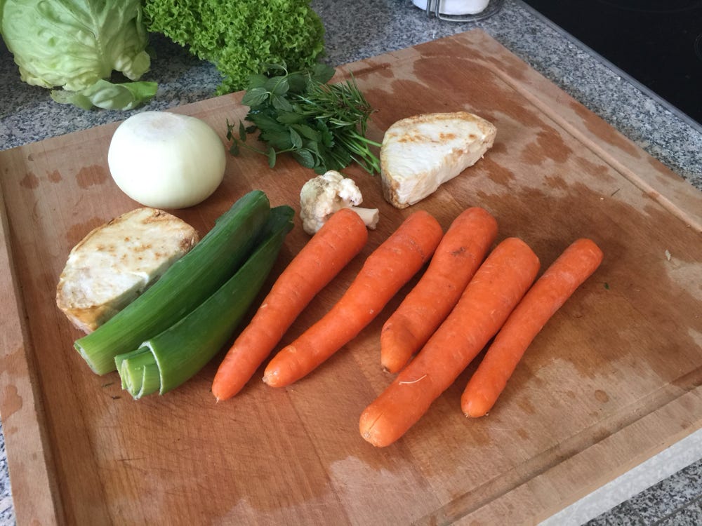 Ihr braucht: 1,5 kg Suppengrün (Karotten, Lauch, Sellerie), Petersilie, 2 Gemüsezwiebeln, etwas grobes Meersalz und wer mag, etwas Minze. Also: 100% Natur.