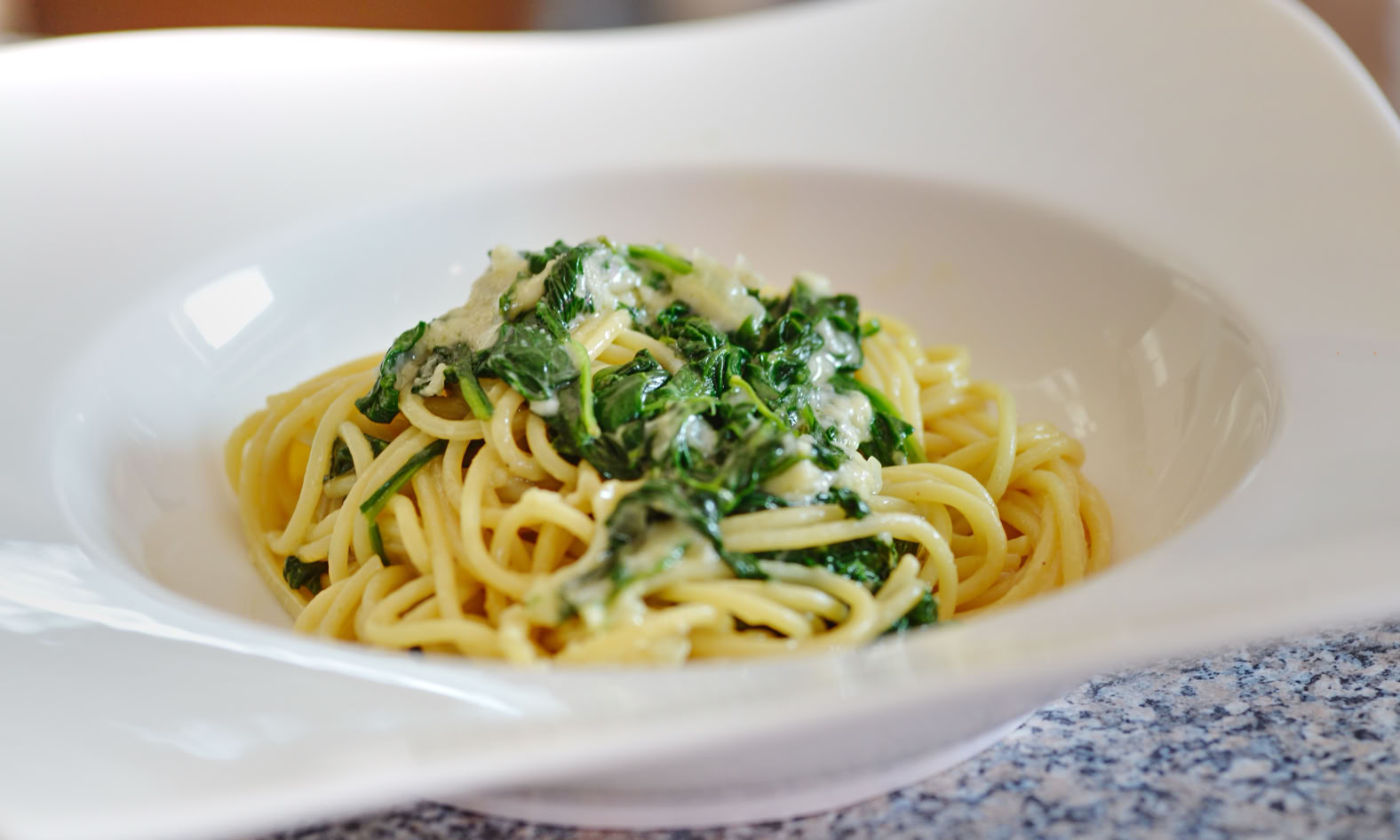 Jetzt wird es schwierig: Die Spaghetti unter den Schalotten-, Knoblauch-, Spinat-Mix heben.