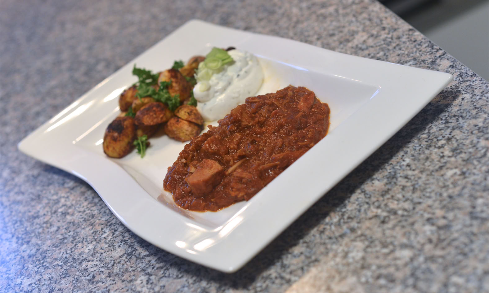 Jetzt alles mit dem Pürierstab verarbeiten, bis wir eine sämige Soße haben. Wenn die Soße nicht dick genug ist, kann gerne noch mit einem Esslöffel Mehl abgebunden werden. Jetzt die Jack-Frucht dazugeben und noch 30 Minuten bei mittlerer Temperatur köcheln lassen.