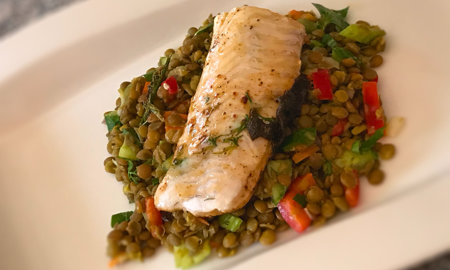 Dann anrichten. Linsensalat auf einen Teller geben. Zander oben drauf.